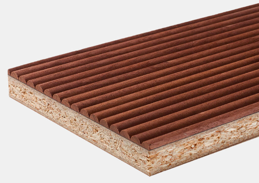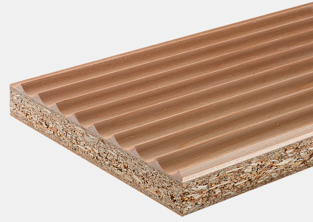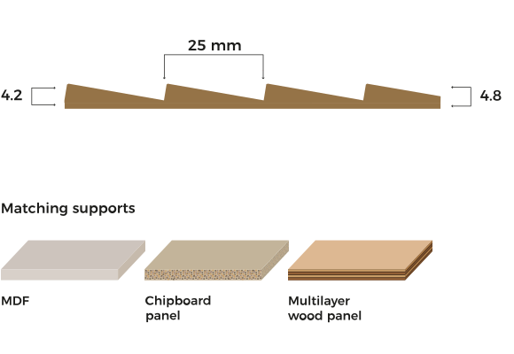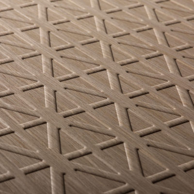 Innovative surfaces, with natural look, that emphasize the three dimensionality and the vintage appearance. Made laminating veneer on core support. Thicknesses: from 1,2 mm to 80 mm and over if required. Maximum dimensions: 2570×1300 mm, with an ideal format of 2440×1220 mm.